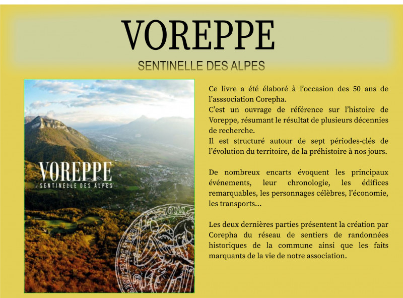 ↓ Pour les 50 ans de l'association, Corepha a édité 2 livres ← Le livre "Voreppe sentinelle des Alpes" ← Le livre "Voreppe mémoires des hommes" ↓En savoir plus sur le patrimoine historique de Voreppe ← Naissance du village de Voreppe (Vidéo) ← Circuit de visite du Bourg ancien. ← 1314, Dossier de Presse des 700ans de Voreppe... ← 1798, Le premier passage de Napoléon à Voreppe ← 1814, Voreppe menacée... ← 1815, Napoléon de retour à Voreppe... ← 1856, Essor Economique,la voie ferrée passe à Voreppe ← 1900, Cartes postales anciennes de Voreppe ← Vidéo descendons du tram pour visiter Voreppe en 1900 ... ← 1914-1918, La guerre mondiale... ← Juin 1940, Voreppe La Résistante... ← 1944, Le 30 juillet à Voreppe... ← 1950, L'école Debelle à Voreppe... ← 1980, Le corso à Voreppe ←1994, Louis Christolhomme raconte Voreppe (Vidéo) ← 2010, La ville de Voreppe...( Roger Figols AMIVE Voreppe) ← Evolution du territoire et dècouvrir Voreppe à travers la Toponymie ↓ Les Voreppins illustres ← Les Voreppins illustres... ← 1930, Igor Stavinski à Voreppe...