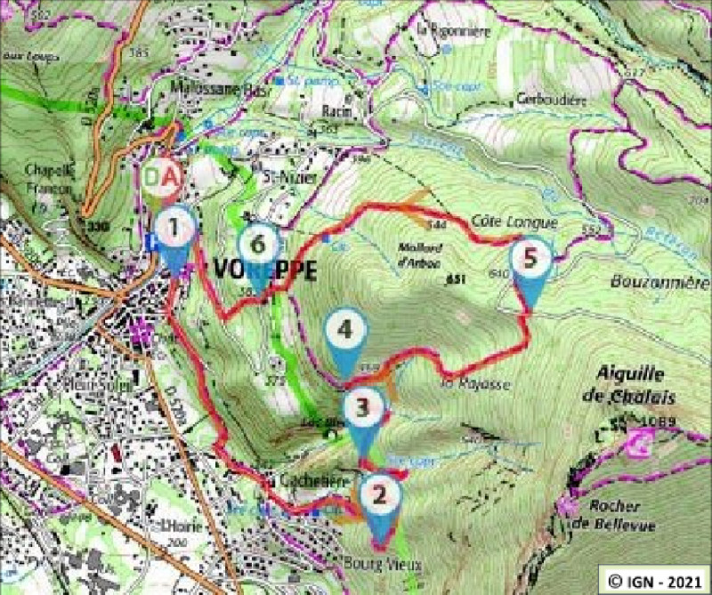 (1) Circuit du bourg de Voreppe à réaliser en fin de randonnée à partir du parking des gradins de Roize où un panneau affiche les différents circuits historiques proposés.