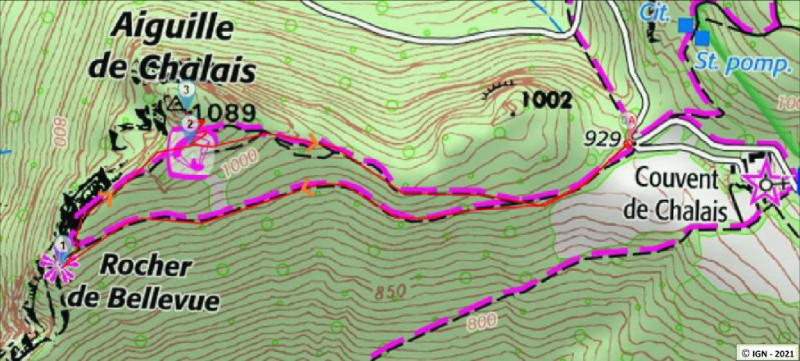 (1) Un très beau point de vue se dévoile sur la vallée de l'Isère et le Vercors. Revenir sur vos pas et prendre le sentier qui part à gauche en direction de l'aiguille de Chalais. Ce sentier suit le faîte des falaises, protégé par des barrières, et franchit à mi parcours un ressaut sécurisé par une main courante.